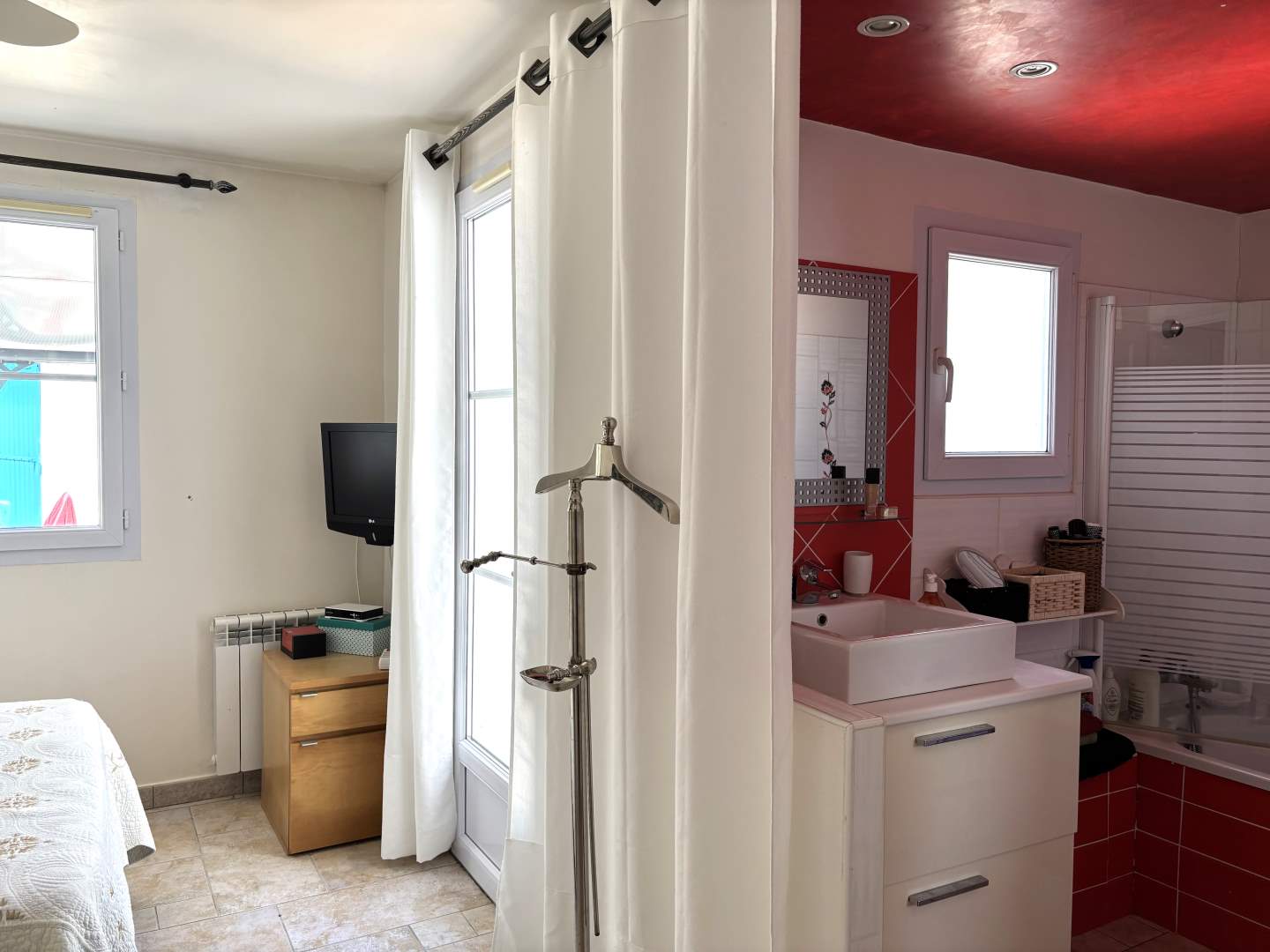- 1ère maison comprenant : entrée, cuisine ouverte sur une pièce de vie avec cheminée insert, 2 chambres dont une avec salle de bains et l'autre avec salle d'eau-WC, WC. Terrasse.