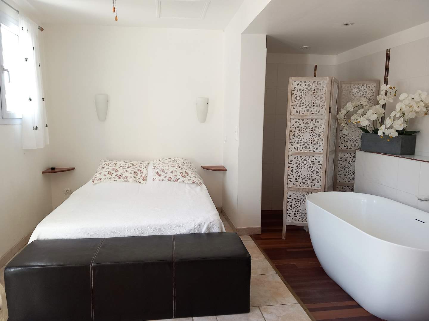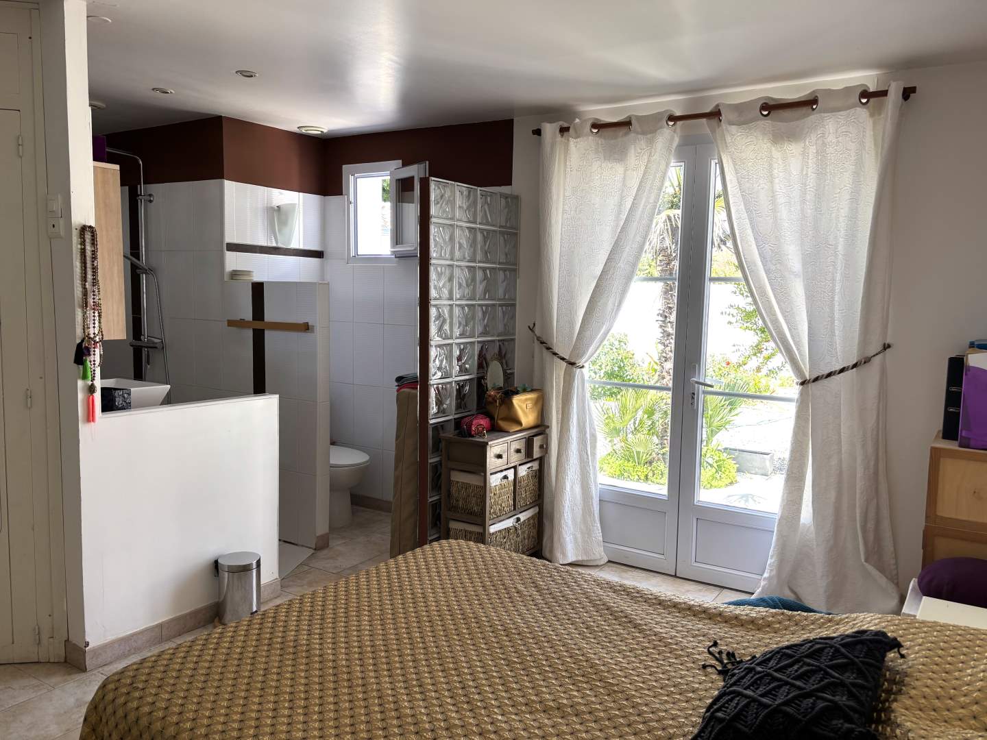 - A l'étage, pièce avec kitchenette, coin nuit, salle d'eau, WC et terrasse.