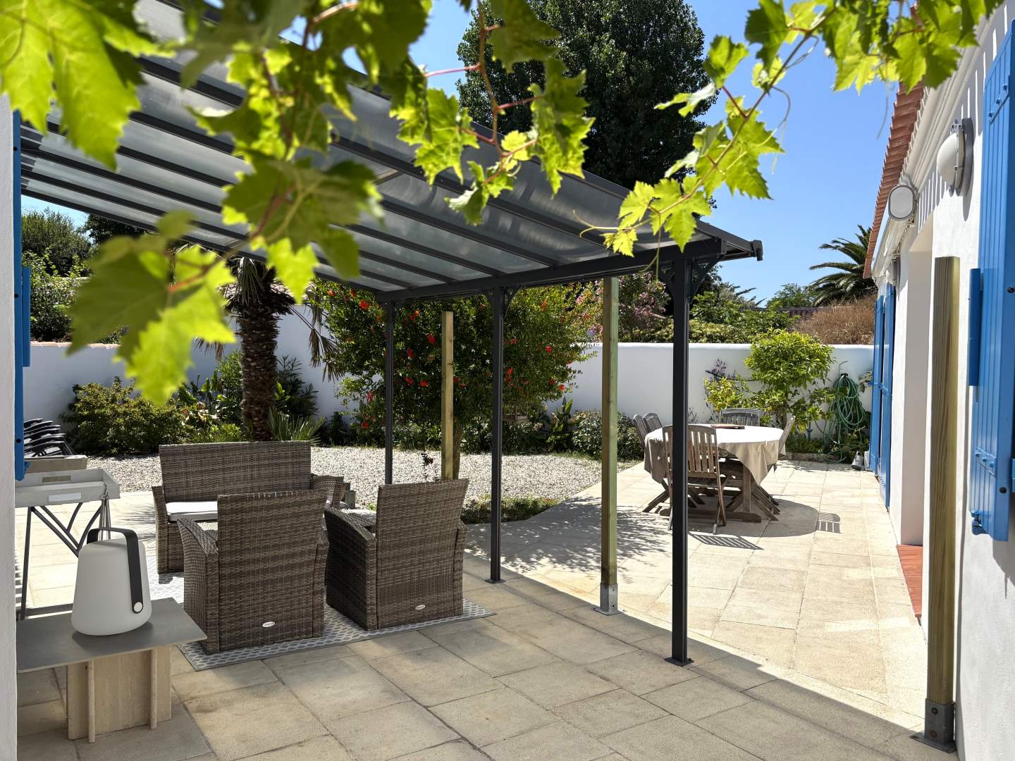 A l'extérieur, des grandes terrasses pavées et un jardinet clos et fleuri.