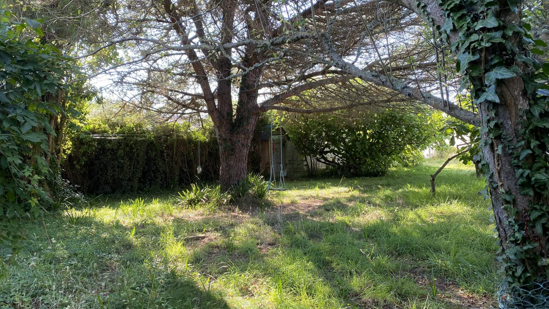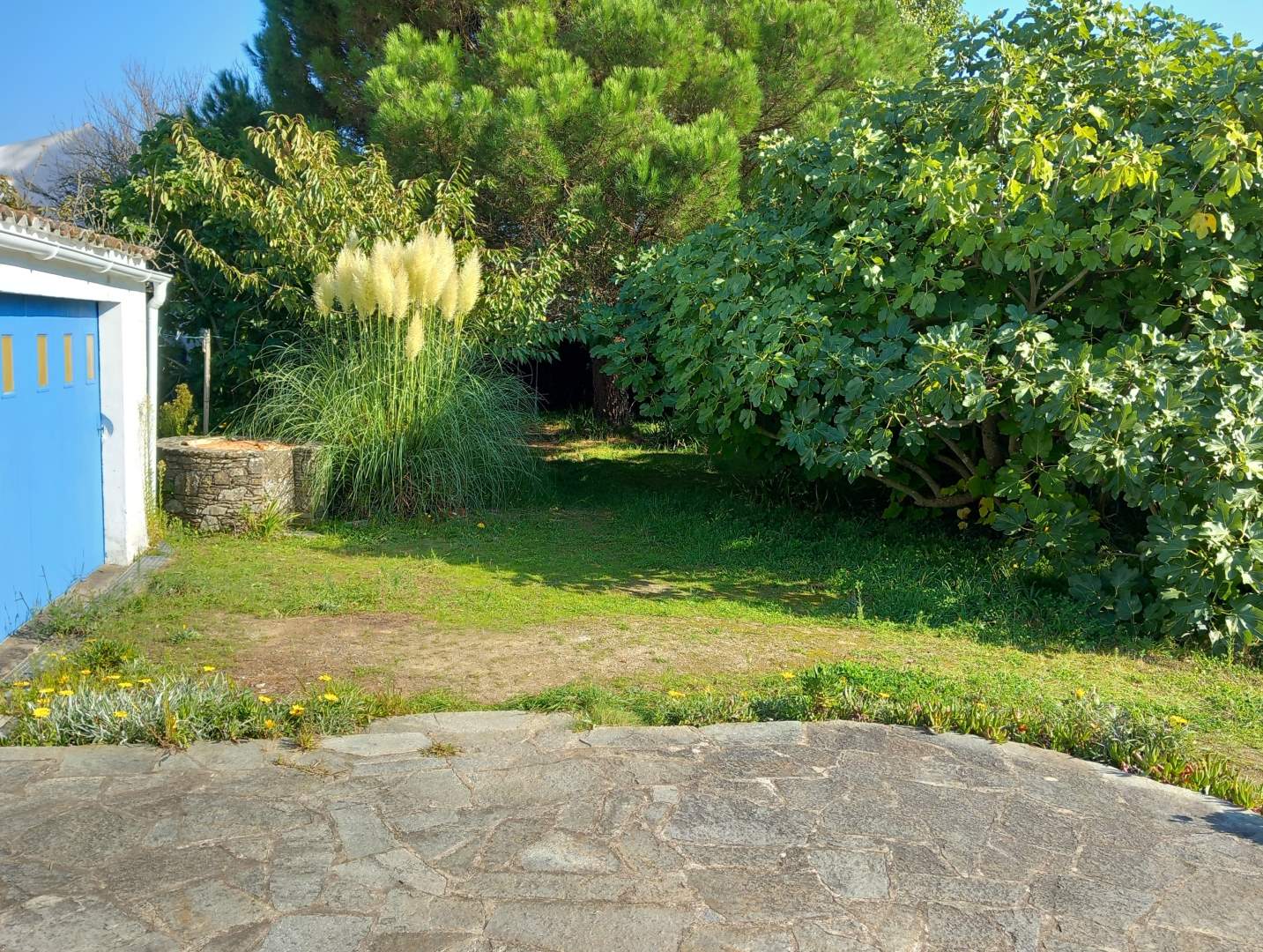 Une terrasse en pierre, un puits et un jardin arboré.